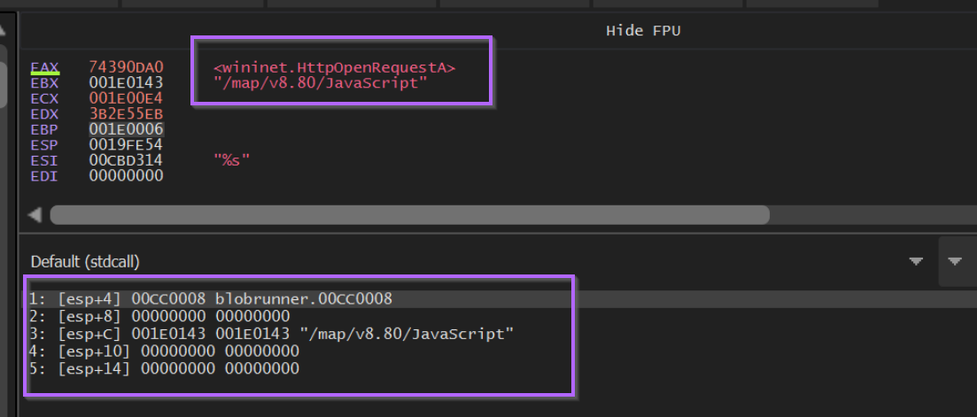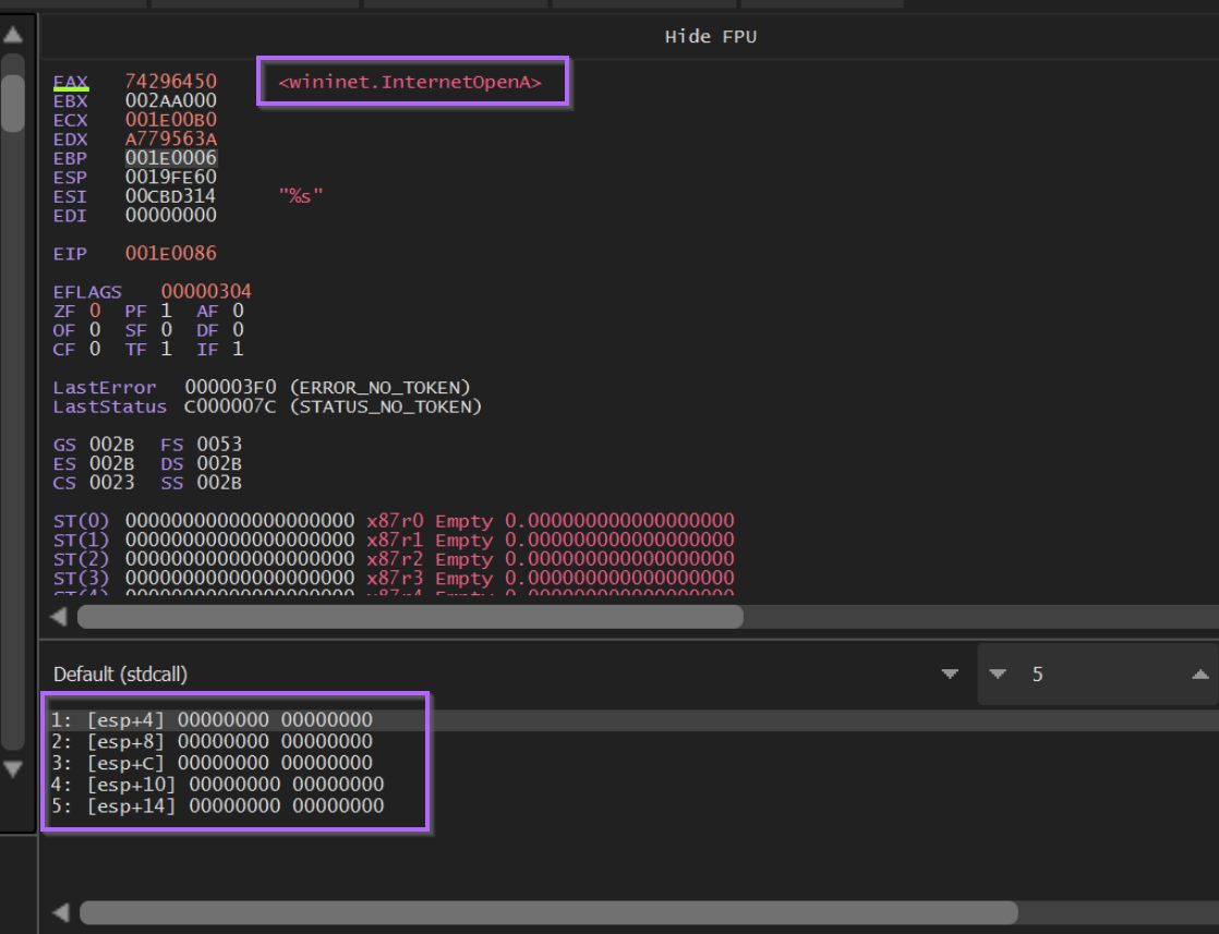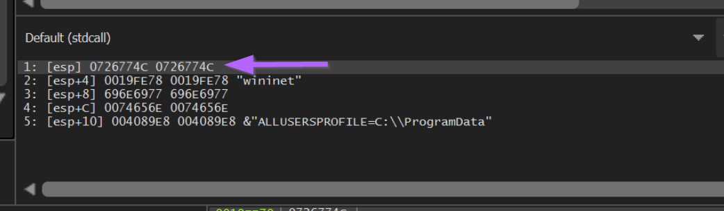 If we observe the stack window below, we can see also see the function arguments. In this case we can see the wininet string passed to LoadLibraryA.