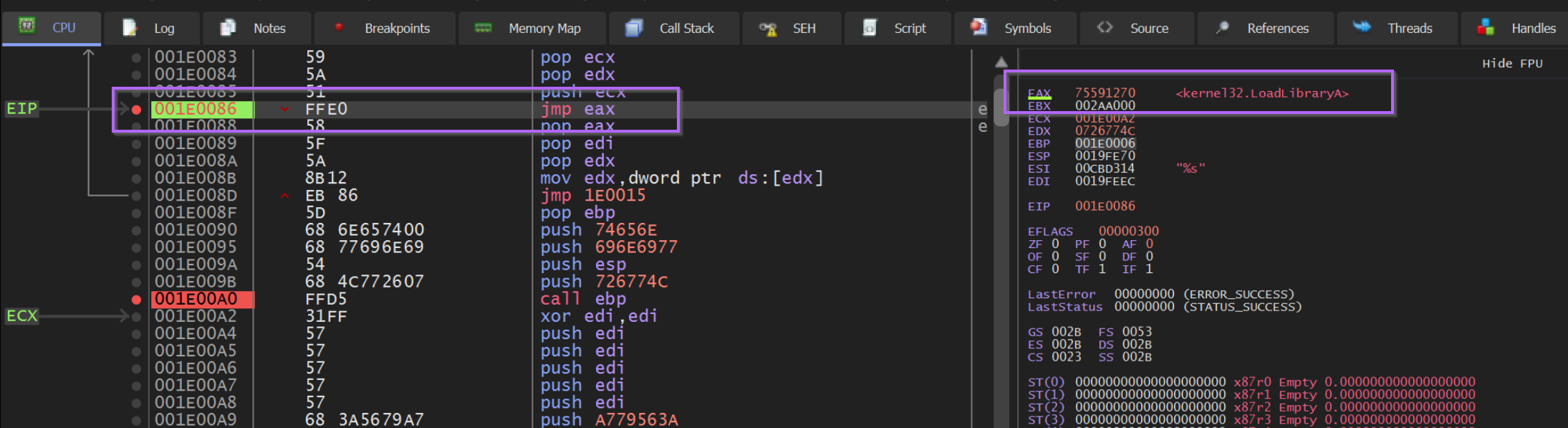 If we recall that the JMP EAX location is at an offset of 0x86, we can also set a breakpoint here with bp 0x001e0000 + 0x86.
