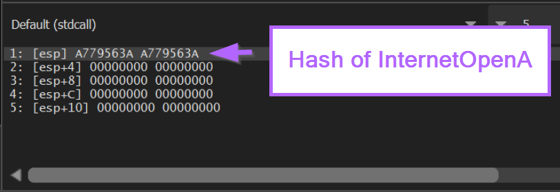 At this point we can see the hash value of InternetOpenA on the stack.