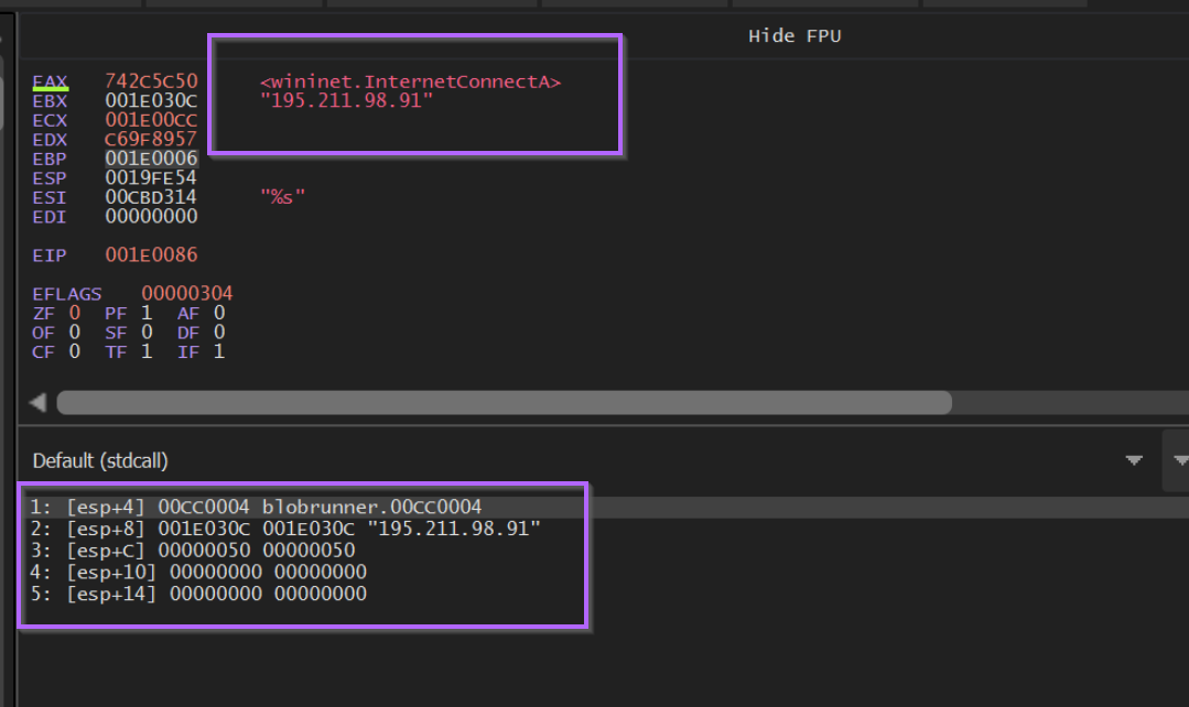 Hitting F9 to continue again, we can observe the decoded value of 0xc69f8957, which corresponds to InternetConnectA.