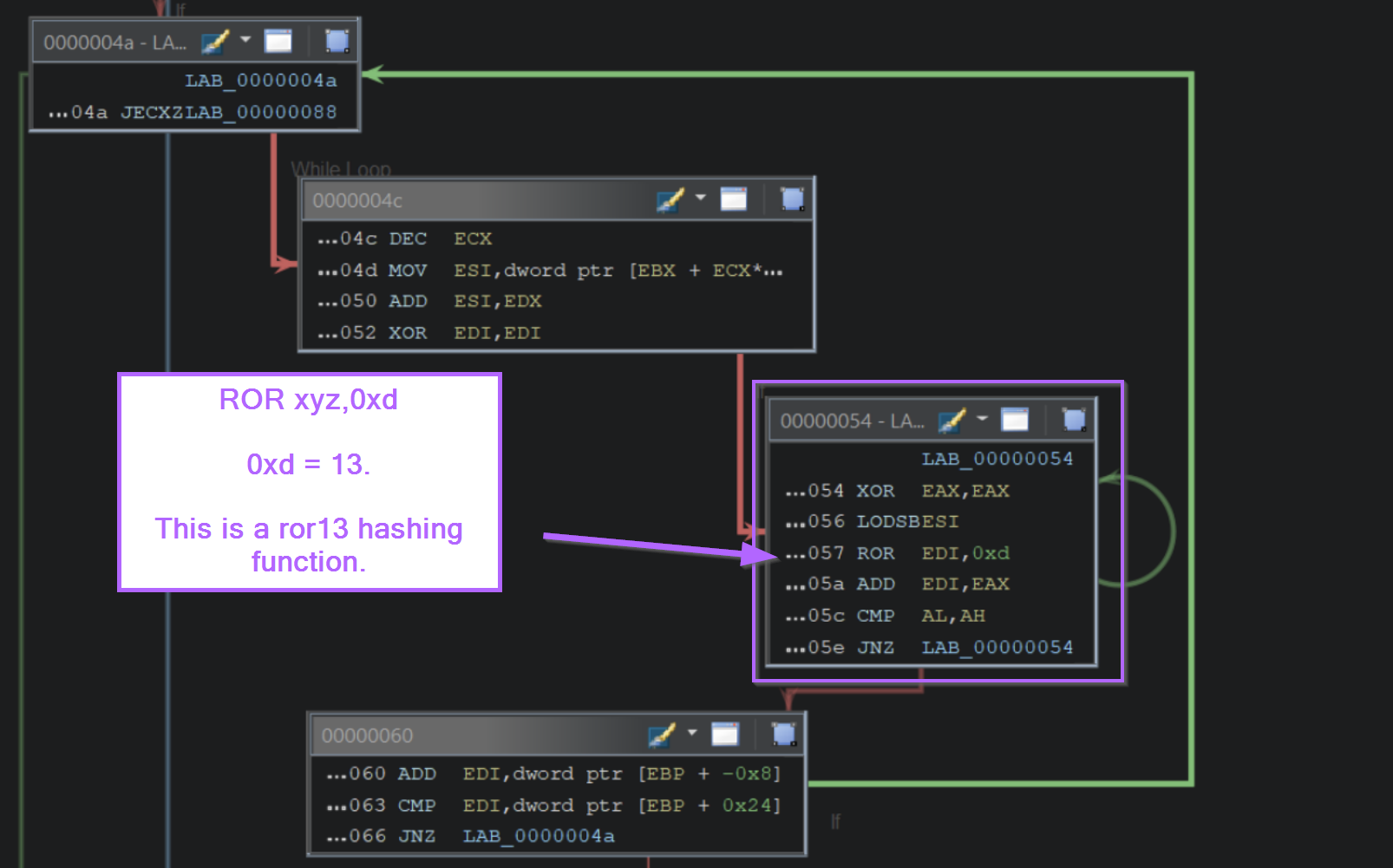 If we zoom into that block, we can see the instructions ROR edi,0xd. (0xd is 13 in hex), this corresponds to the ROR 13 hashing logic used by Cobalt Strike and Metasploit.