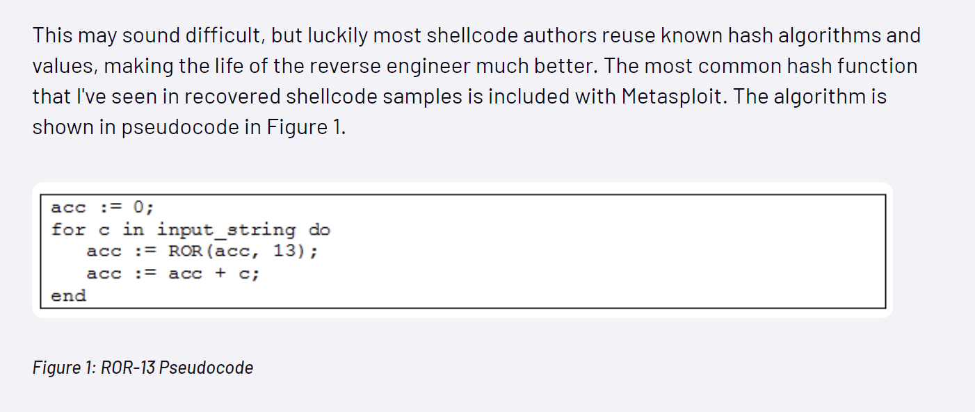 In this case, googling ror13 hashing returned a great blog from Mandiant that includes Pseudocode and explanations of ROR13.