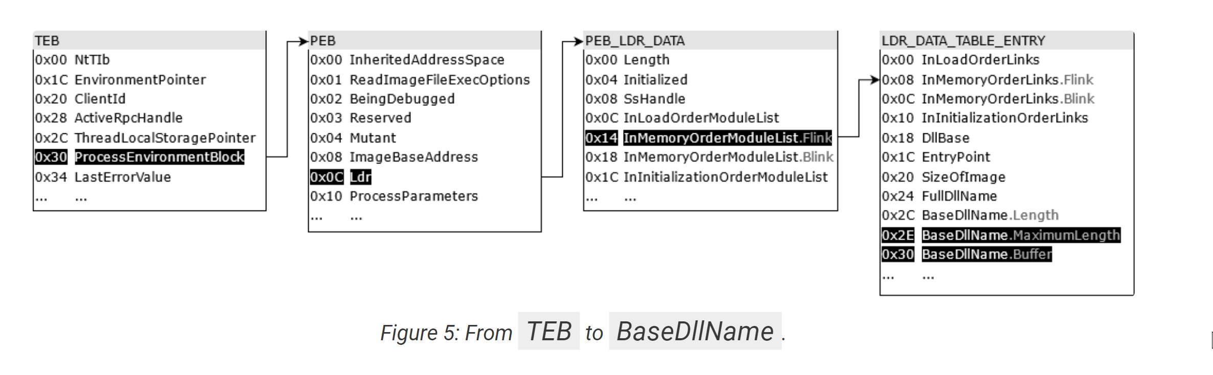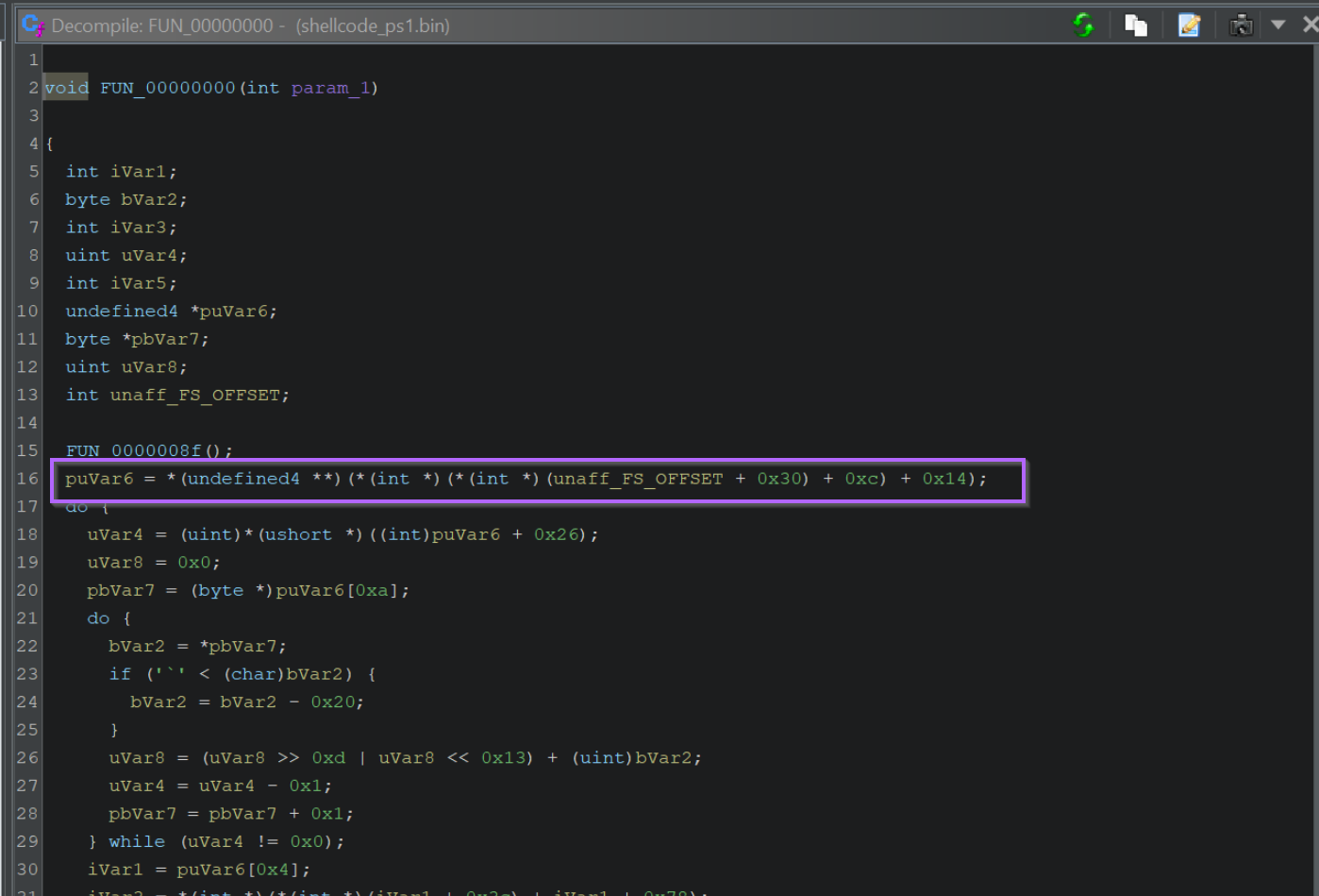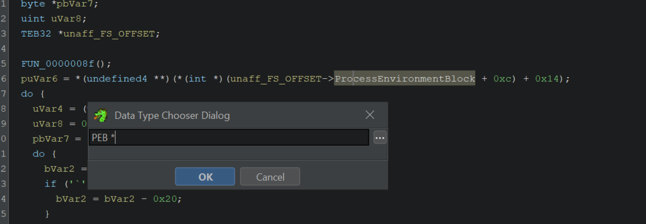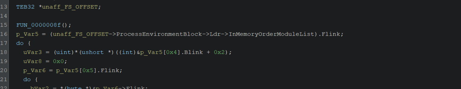 By googling for offsets like the 0x30, 0xc, 0x14 seen above, we can determine that the unaff_FS_offset value is a TEB structure.