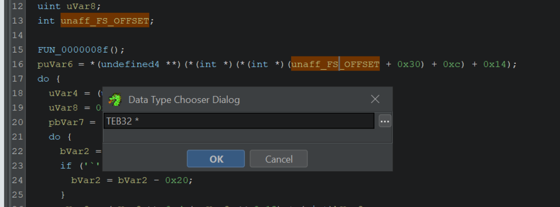 By selecting unaff_FS_offset and right-click -> retype variable, we can declare a TEB pointer with TEB32 *