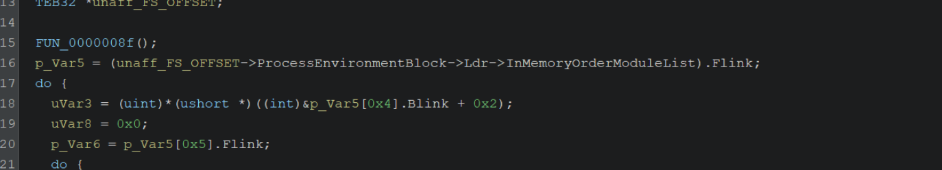 This is where the Thread Environment Block is accessed to obtain a list of all loaded modules (DLLs). From here, the list is enumerated and hashed in order to locate functions.