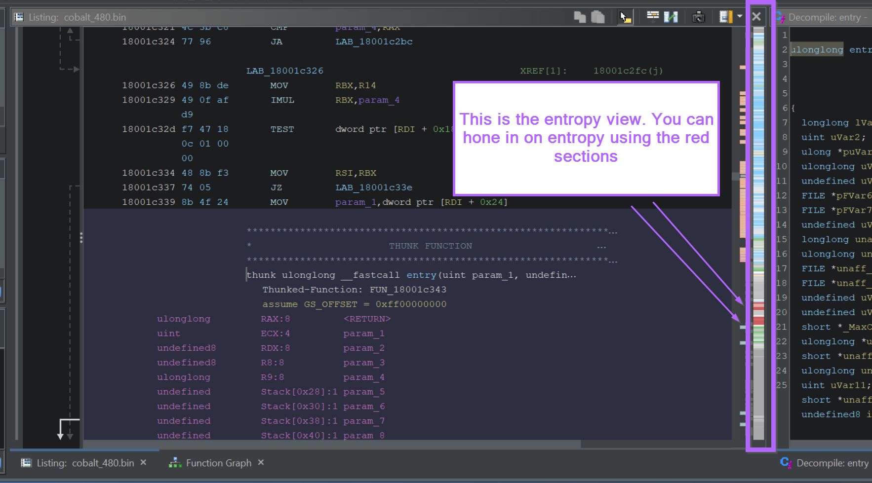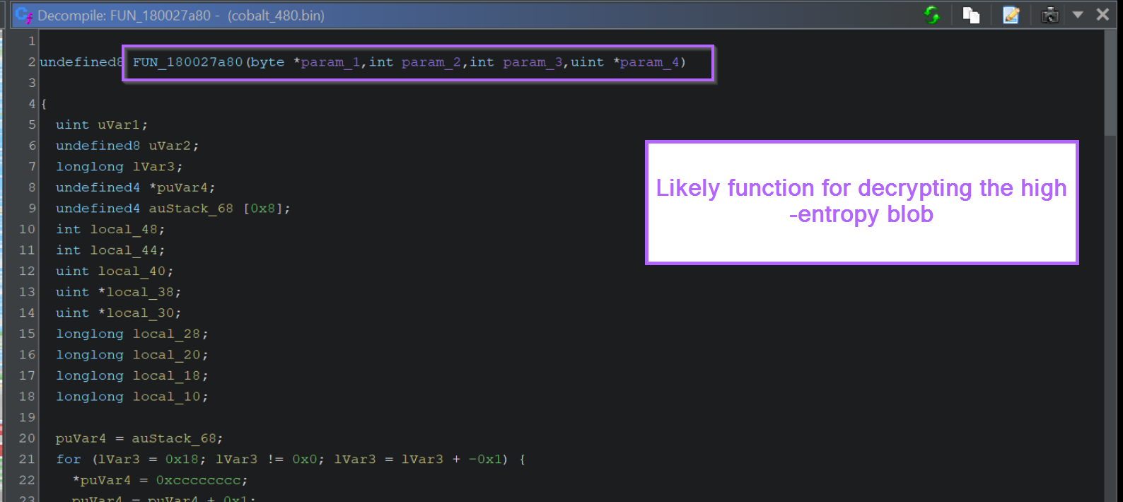 In this post, we have used Ghidra to identify an encryption function present inside a Cobalt strike sample. We have identified an area of high entropy and also identified that the encryption used might be AES.