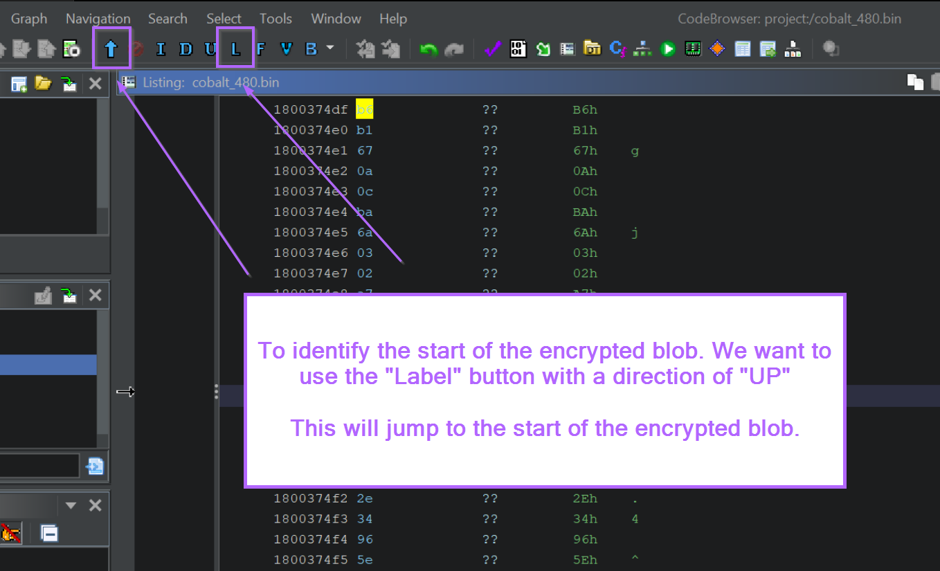 To locate the start of the encrypted blob, we can use the "Go To Previous Label" button, making sure to set the arrow direction to "UP".