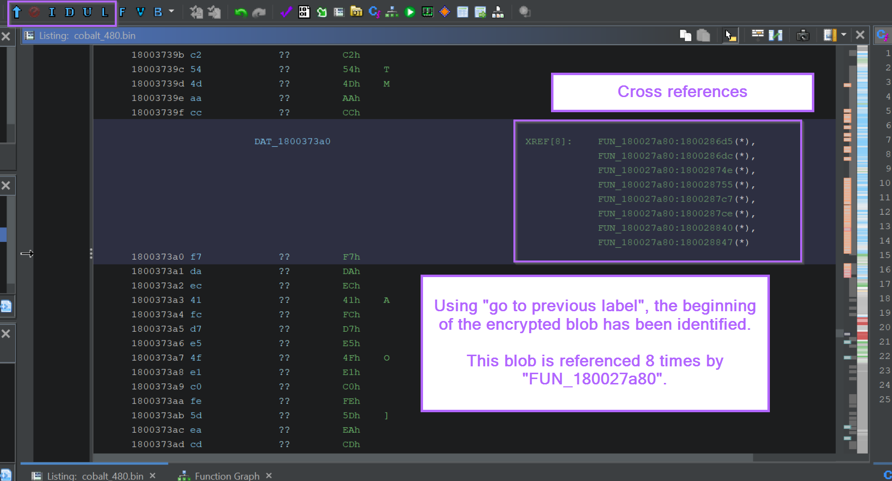 This will move the screen to the beginning of the encrypted blob, in this case the beginning was found at DAT_1800373a0. We can also see that this location is referenced 8 times by the function FUN_180027a80.