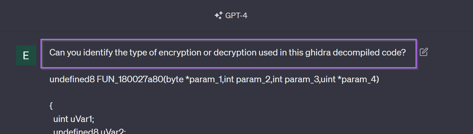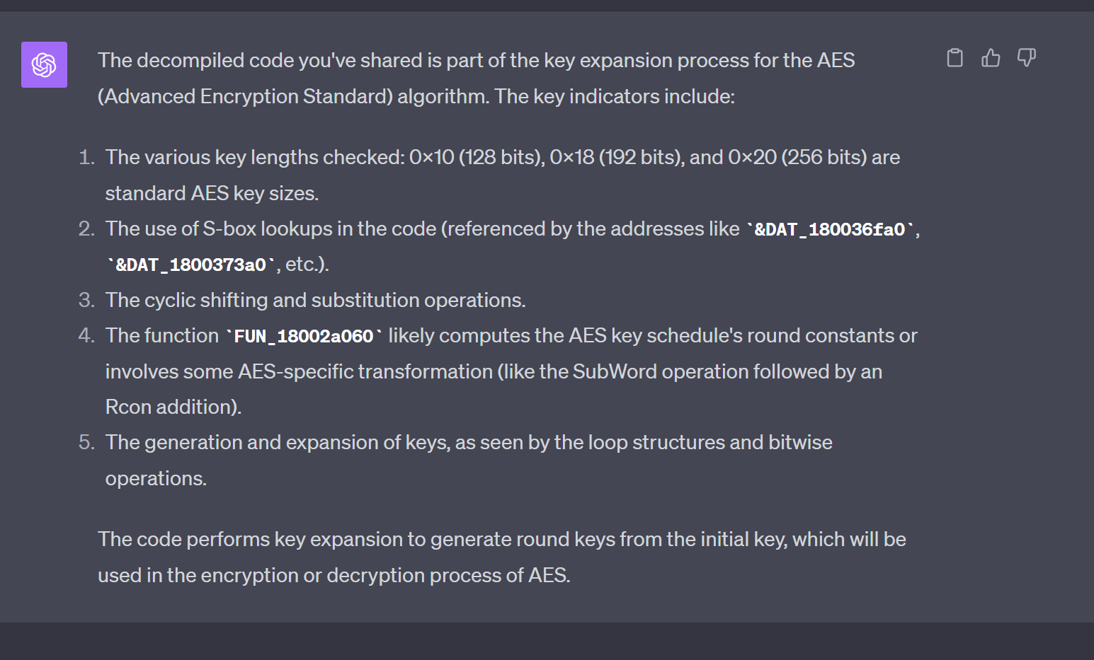 To identify the type of decryption/encryption used, I copied out the entire decompiled function as asked ChatGPT if it could identify it.