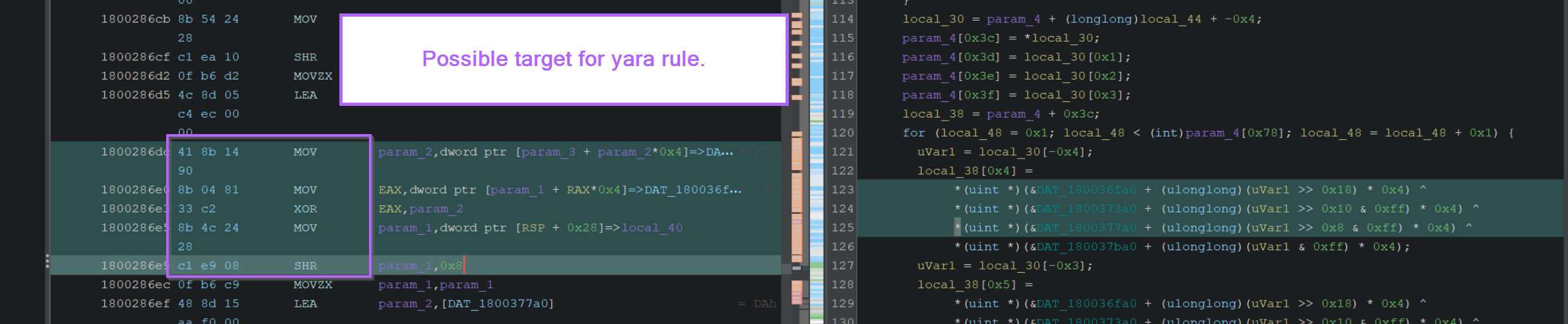 - If a decryption method is found, look for unique instructions that can be used in a Yara rule.