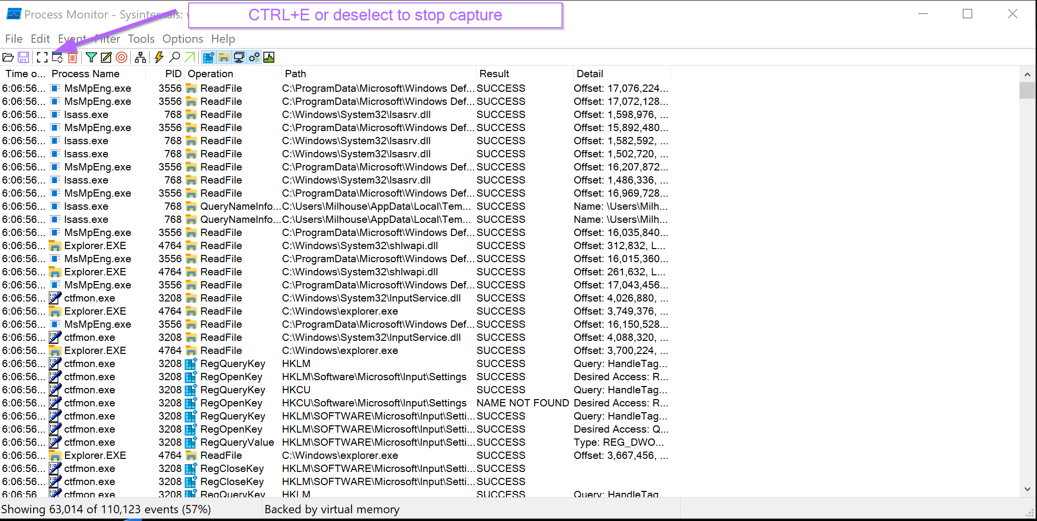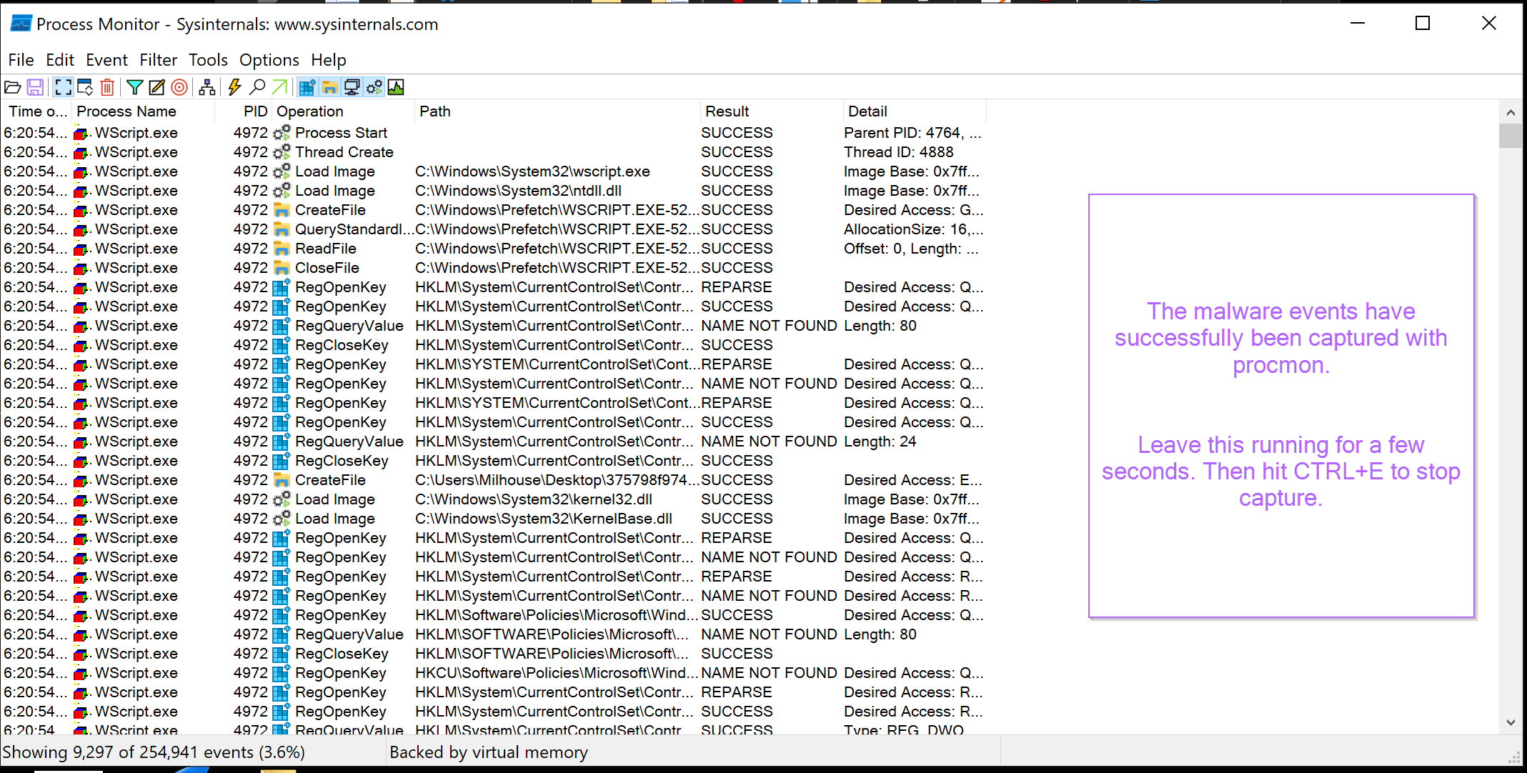 With the filters correctly set, the events will now be captured using Procmon.