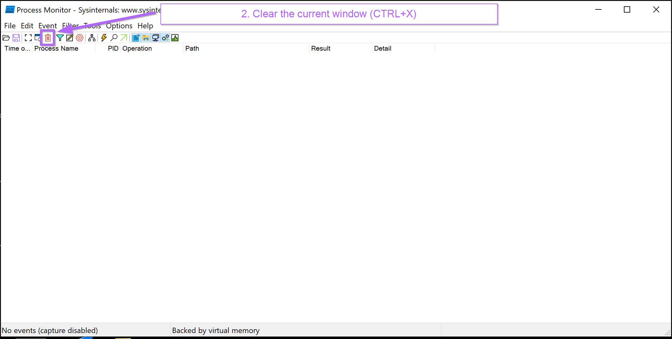 Once the capture has been stopped, the already captured events will need to be cleared from the screen.