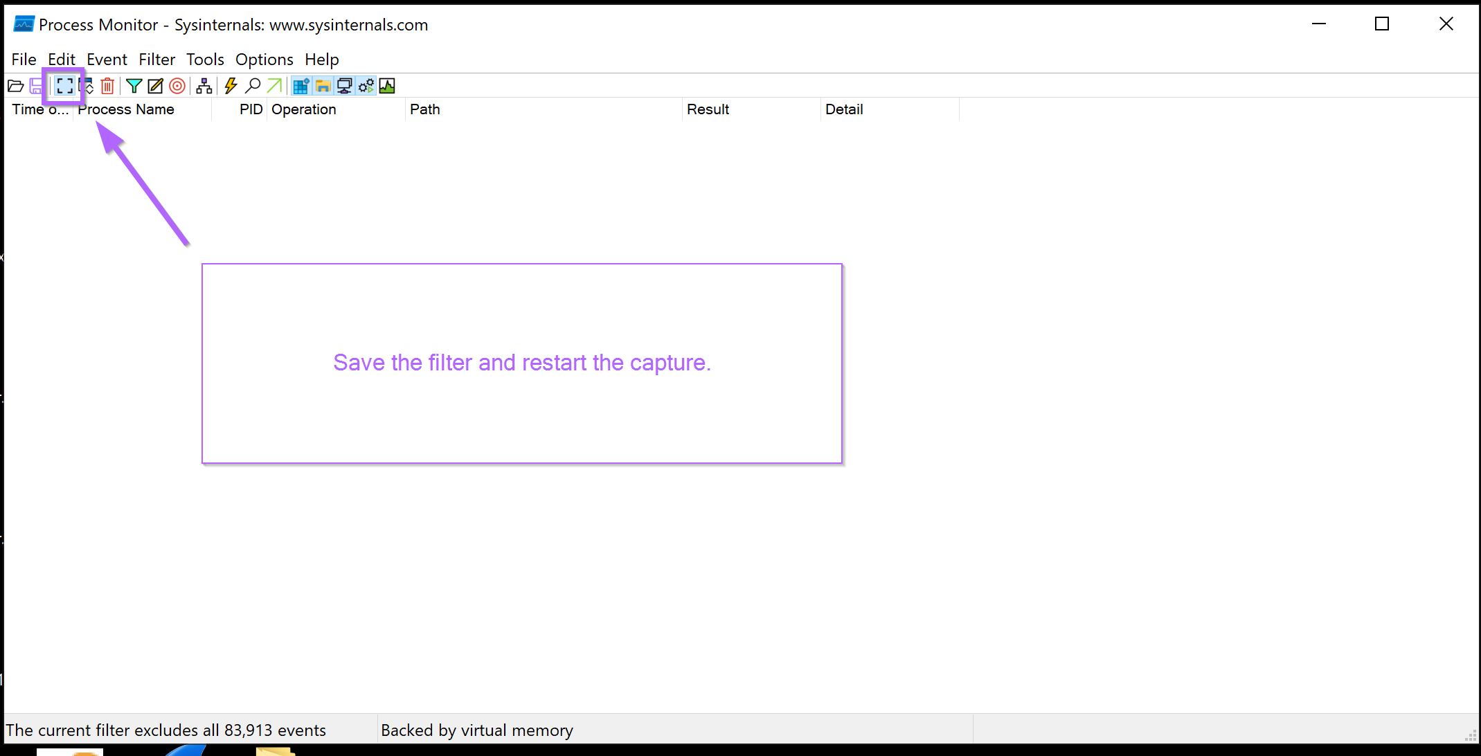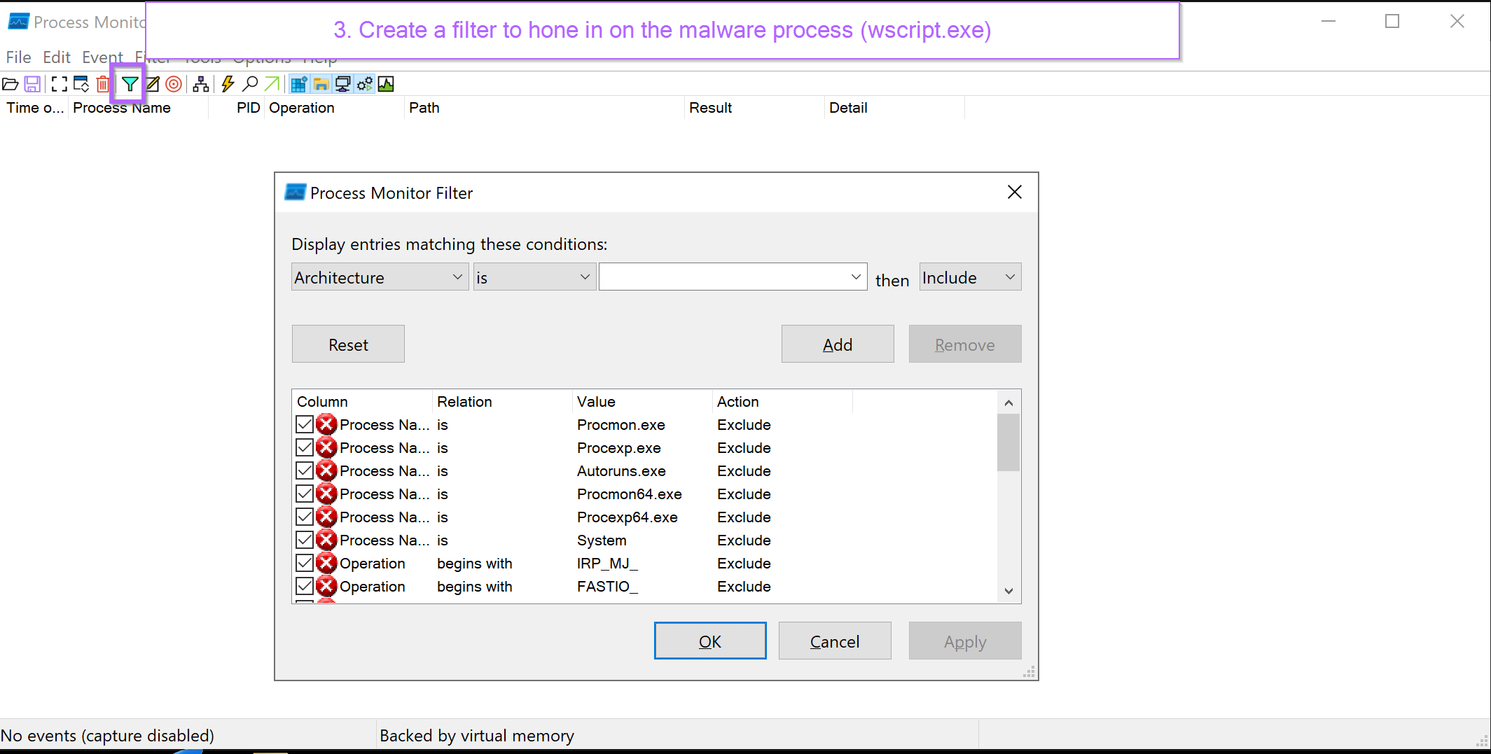 Since Procmon can capture hundreds of thousands of events per second, this can quickly eat up memory, so you want to make sure to capture the right events.