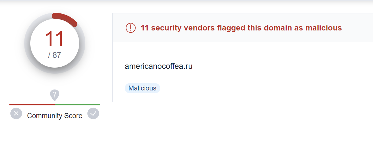 The domain americanocoffea[.]ru had 11/87 detections at the time of writing 2023/05/23. There was no information available on VirusTotal to determine which malware was being downloaded.