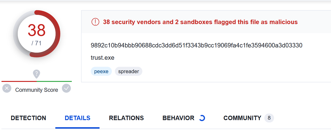 Checking the file hash on VirusTotal. There are 37/71 detections.