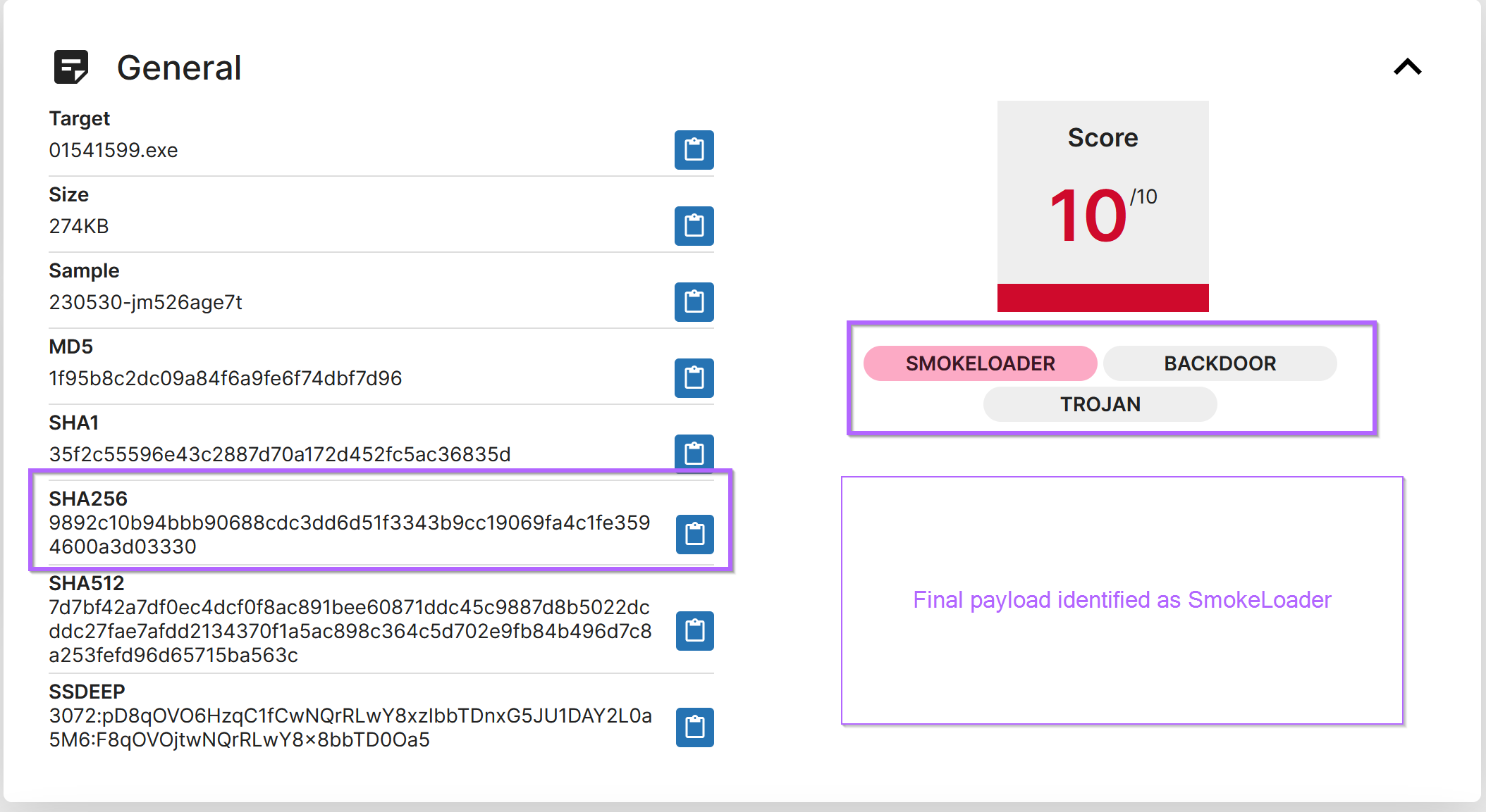 At this point, I would be confident to label the malware sample and incident as Smokeloader.