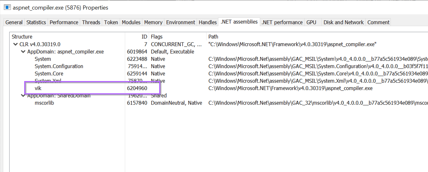 Recall that we previously used Process Hacker and the .NET Assemblies tab to identify the suspicious vik module. Which had a corresponding "Path" of aspnet_compiler.exe