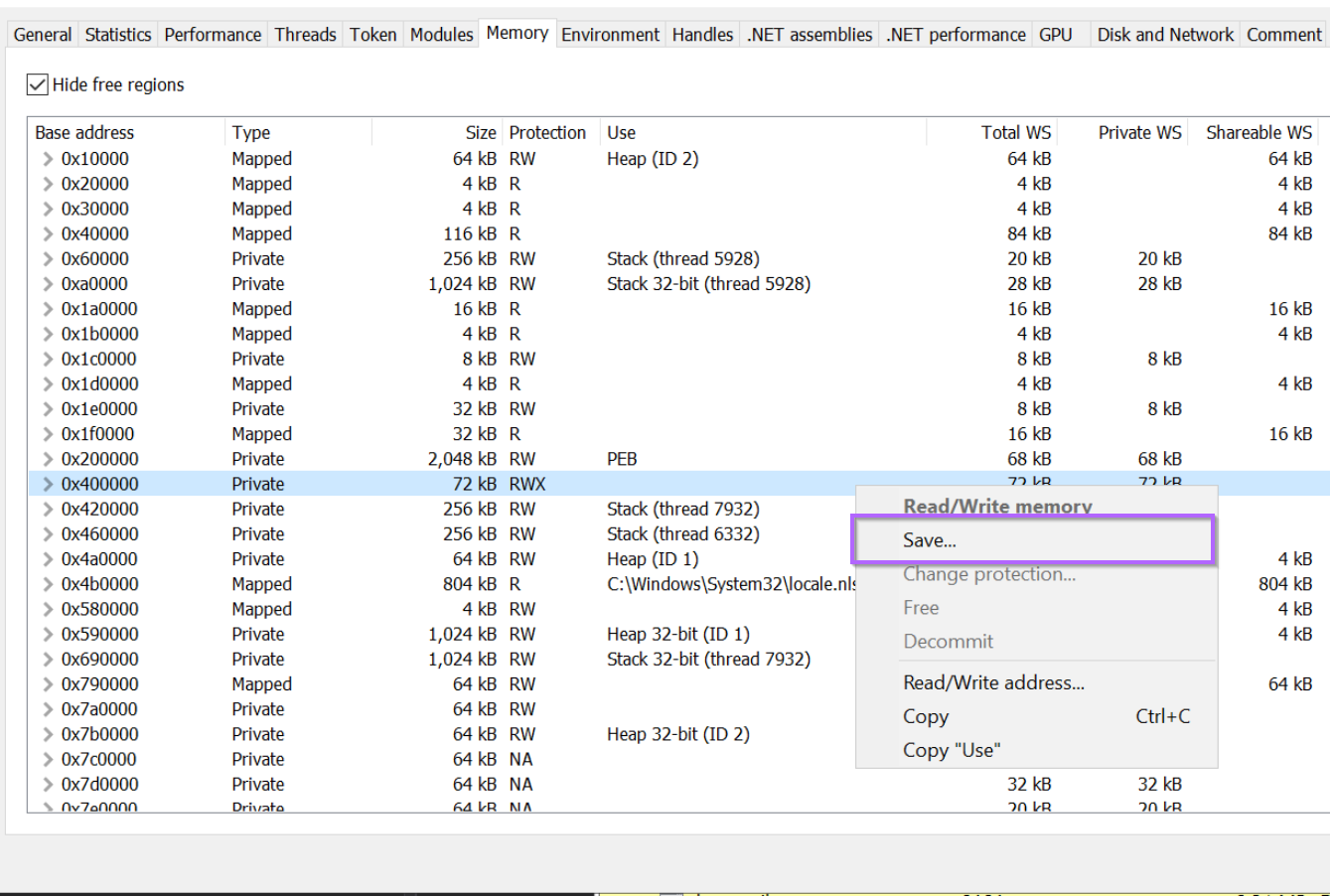 By right-clicking on the memory region 0x40000, we can save it to disk for further inspection.