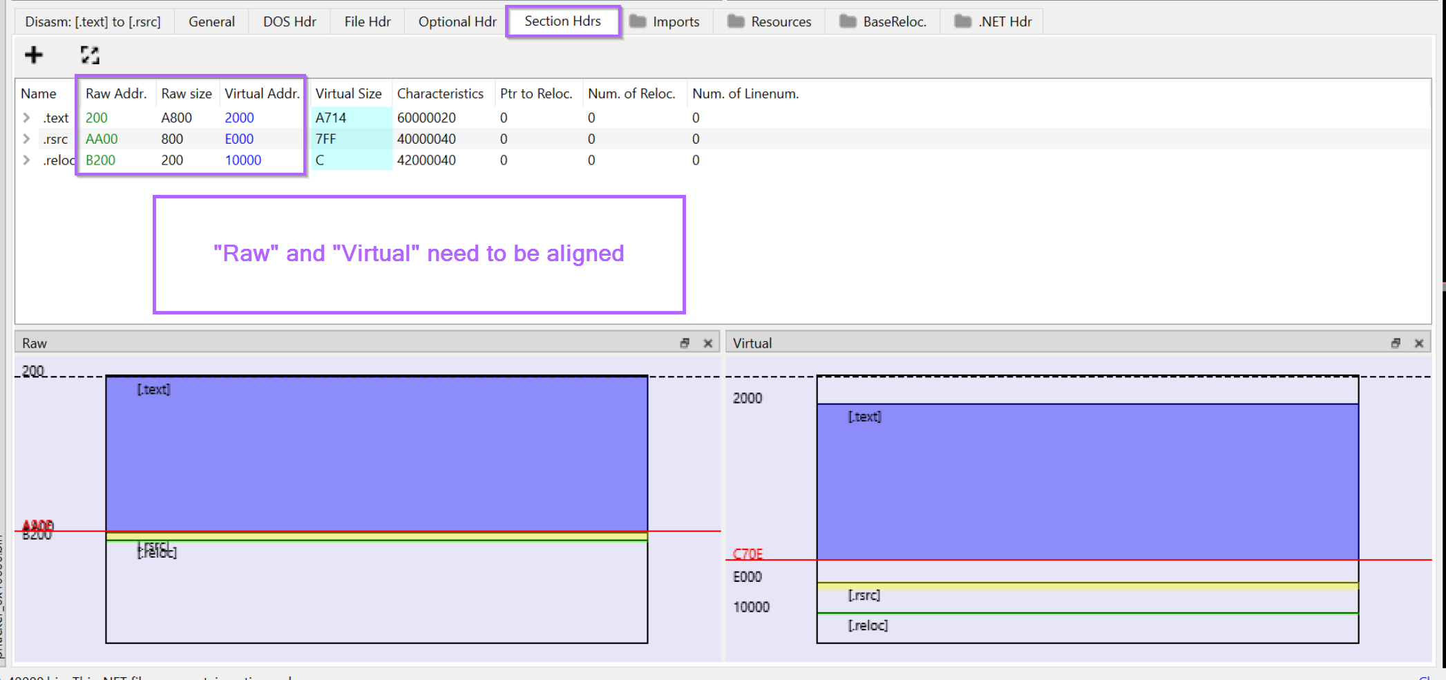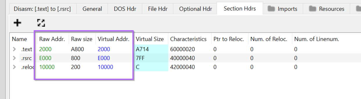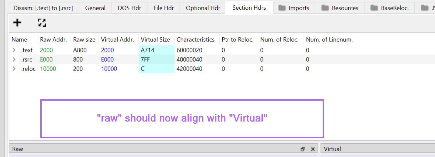 With confirmation that the sections are contained at their "virtual" addresses. We can go ahead and redirect the raw addresses to their virtual address.