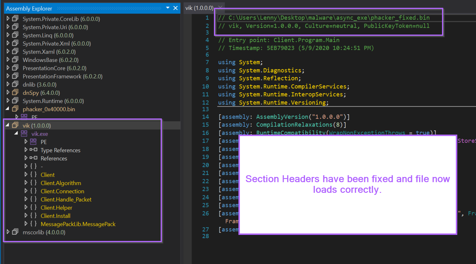 With the section headers now fixed, we can go ahead and re-open the file inside of Dnspy.