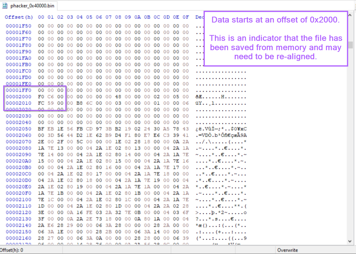 If we open the file inside of a hex editor, we can see that it starts at 0x2000. Which is the virtual address seen in pe-bear. This is an indicator that the section headers will need to be re-aligned.