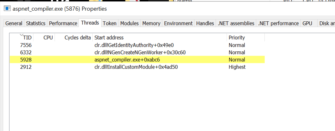 For example, we can use the threads tab to view running threads inside of the aspnet_compiler.exe process.