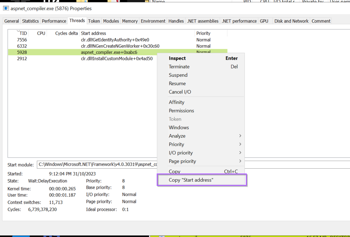 One of these threads stands out as different to the others. It's also running from aspnet_compiler.exe memory space which we already suspect may be overwritten with malicious content.