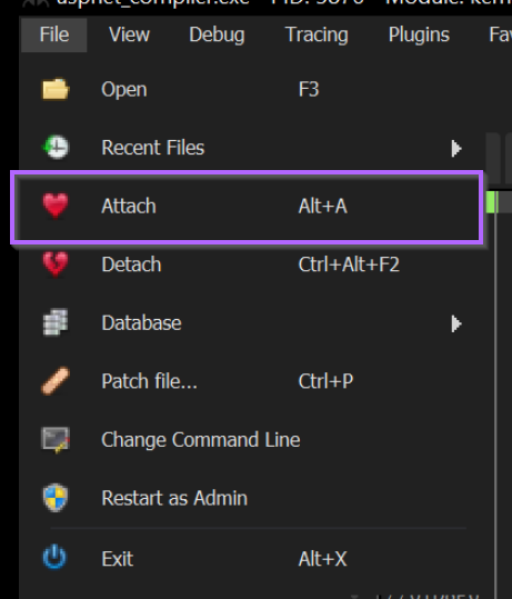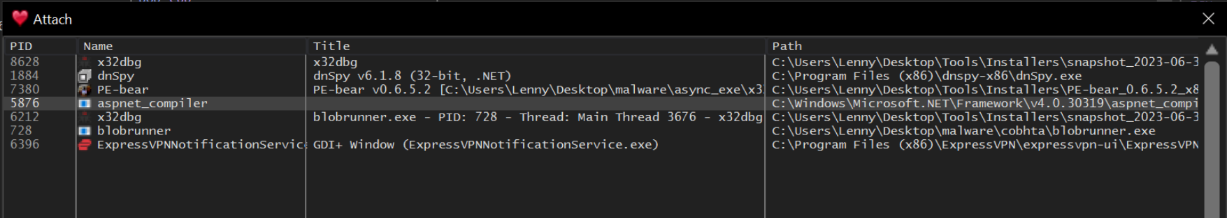 With a suspicious address now identified, we can go ahead and attach to aspnet_compiler.exe using x32dbg.