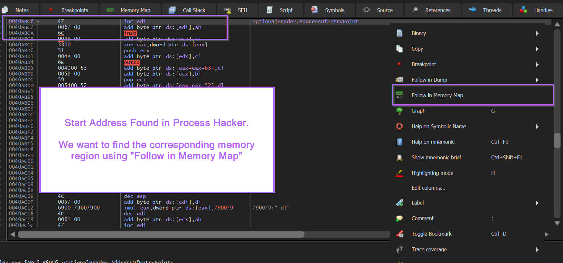 With the process selected and the debugger attached, we can go ahead and jump the starting location of the suspicious thread.