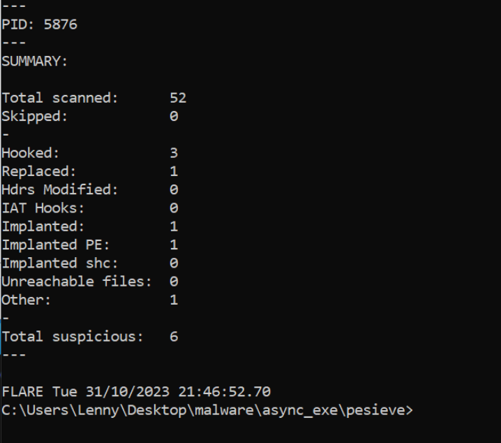 To scan the process and obtain the unpacked payload, we can run pe-sieve and pass the pid parameter of 5876 (or whichever the pid is in your situation).