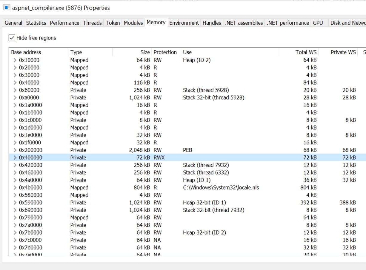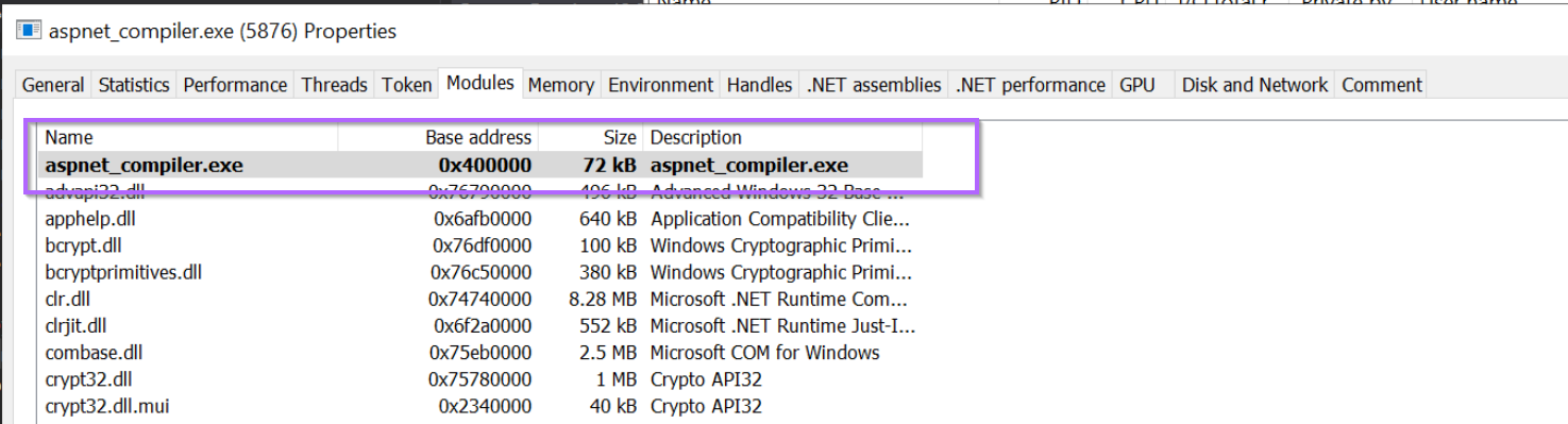 By browsing to the Modules tab of Process Hacker, we can obtain the base address of which aspnet_compiler.exe has been loaded into memory.